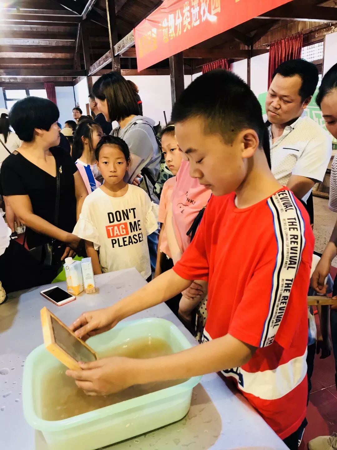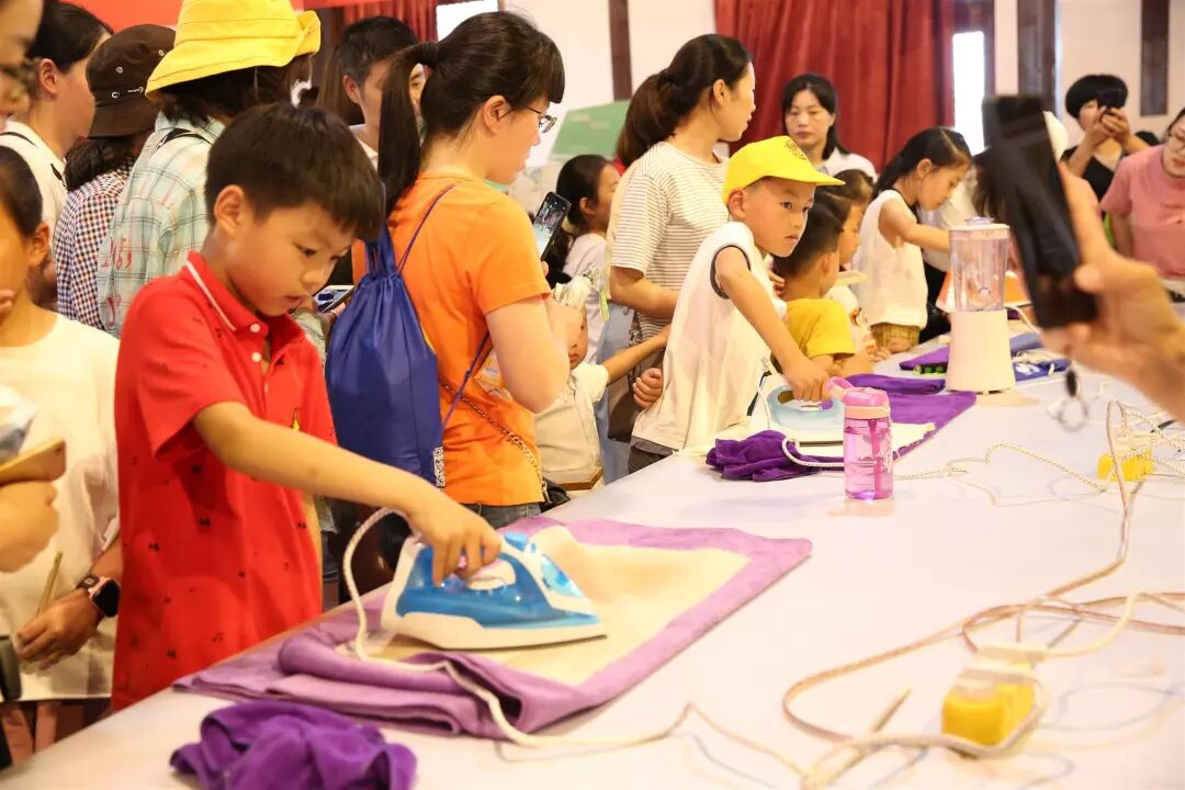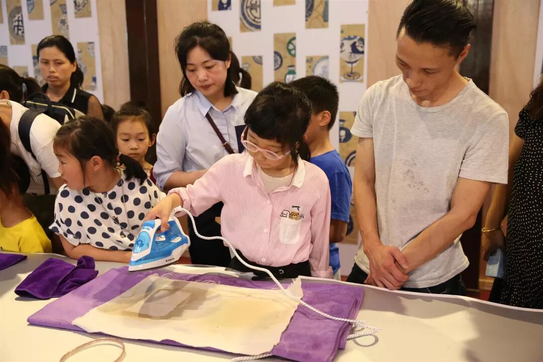 再生造纸体验区现场十分热闹。小朋友用牛奶盒分离出来的纸浆,拿着网格木框轻轻一捞,用毛巾吸干水分,拿电熨斗小心地烫平,看着一张崭新的再生纸诞生,大家喜笑颜开,成就感满满。