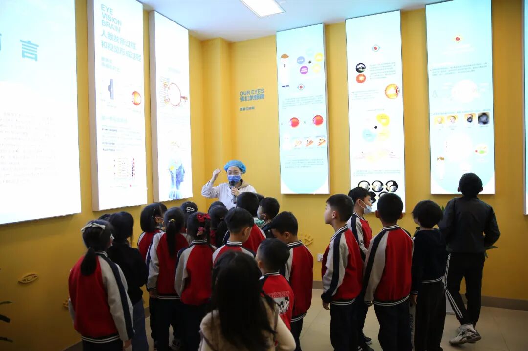 随后参观科普馆,工作讲解人员从人眼发育过程和视觉形成过程、常见的眼睛疾病和眼睛的保健三方面进行了介绍。视觉艺术区内,以视觉错觉为主题,让孩子明白通过视觉错觉原理,有效地改变人对空间信息的接收,可以改变人和空间的交互感受。互动展示区内,通过孩子们自己动手操作,了解了三原色的原理、光的折射、透镜的成像等科学原理。