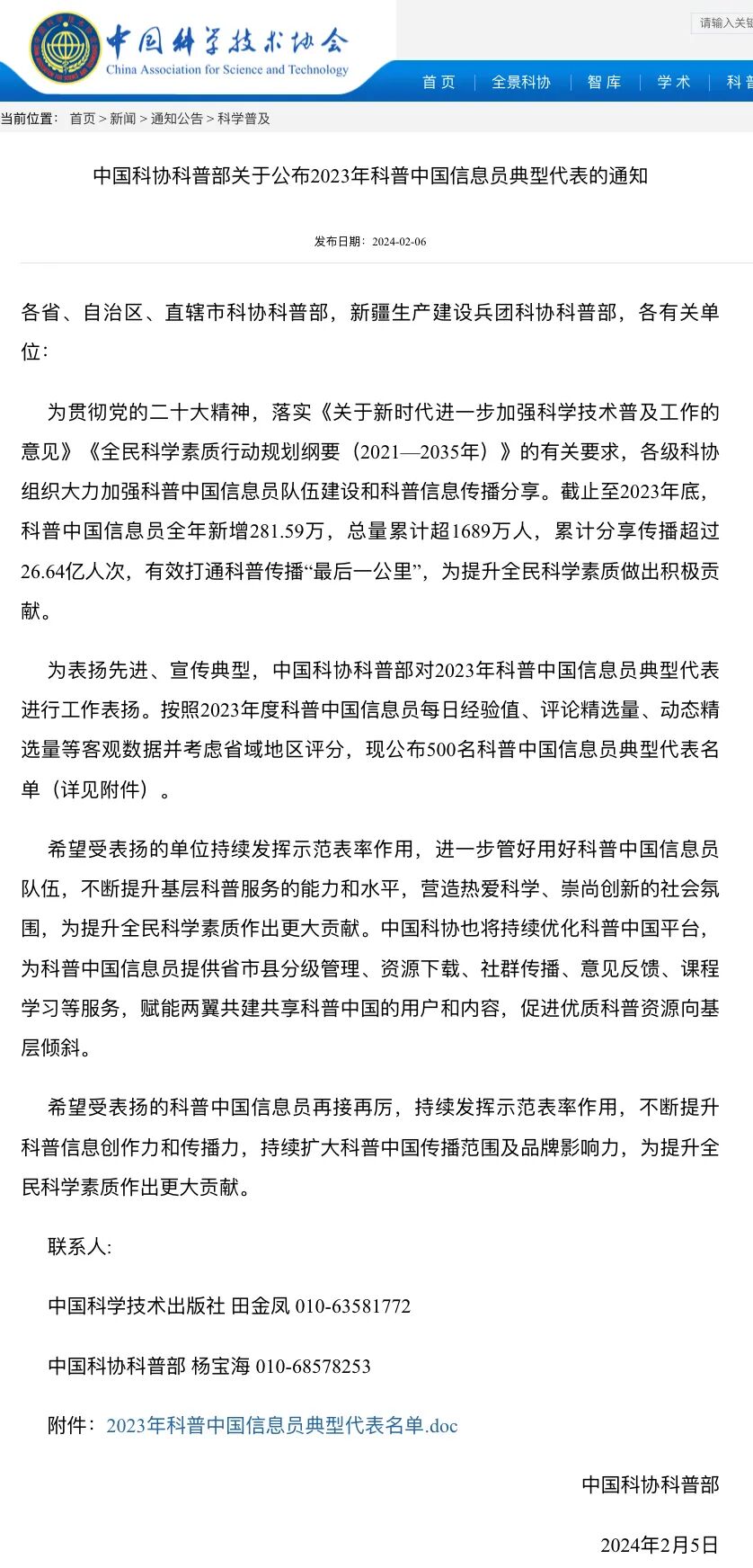 此次评选按照2023年度科普中国信息员每日经验值、评论精选量、动态精选量等客观数据并考虑省域地区评分,通过加权打分,公布综合排名前500的科普中国信息员典型代表。