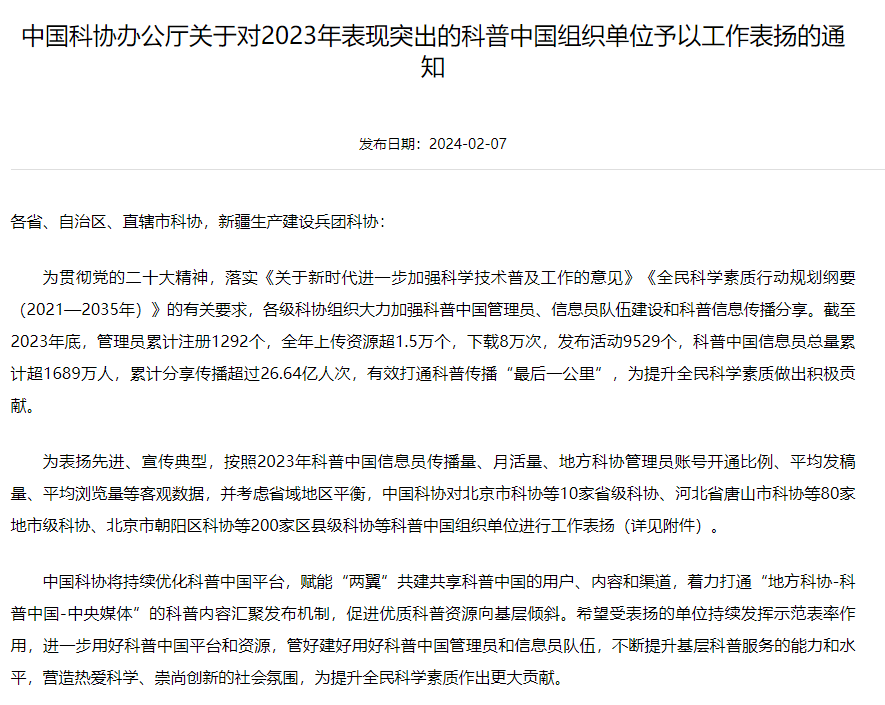 近日,中国科协办公厅下发《关于对2023年表现突出的科普中国组织单位予以工作表扬的通知》,杭州市美彩国际位列全国200强区县级科协名单,此为区科协多次获得此项殊荣。同时,据中科协科普部公布2023年科普中国信息员典型代表的通知获悉,全国500强大名单中,我区17位市民榜上有名。