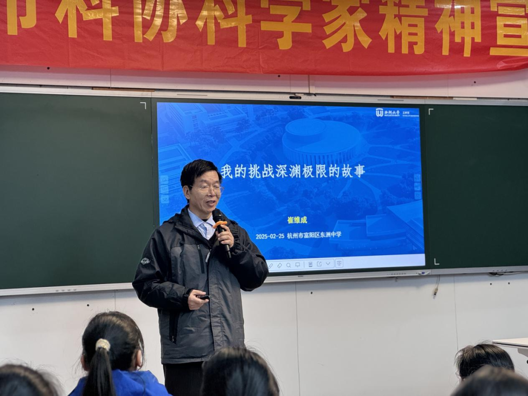 2月25日下午,由杭州市科学技术协会、美彩国际、杭州创业发展促进会、杭州市富阳区东洲中学等单位组织开展的“杭州市科学家精神”宣讲活动在富阳区东洲中学顺利开展。杭州市科学家精神宣讲团成员、西湖大学深海技术研究中心主任崔维成老师作题为“我的挑战深渊极限的故事”的科学家精神宣讲,杭州市富阳区东洲中学全校师生1564人参与本次活动。